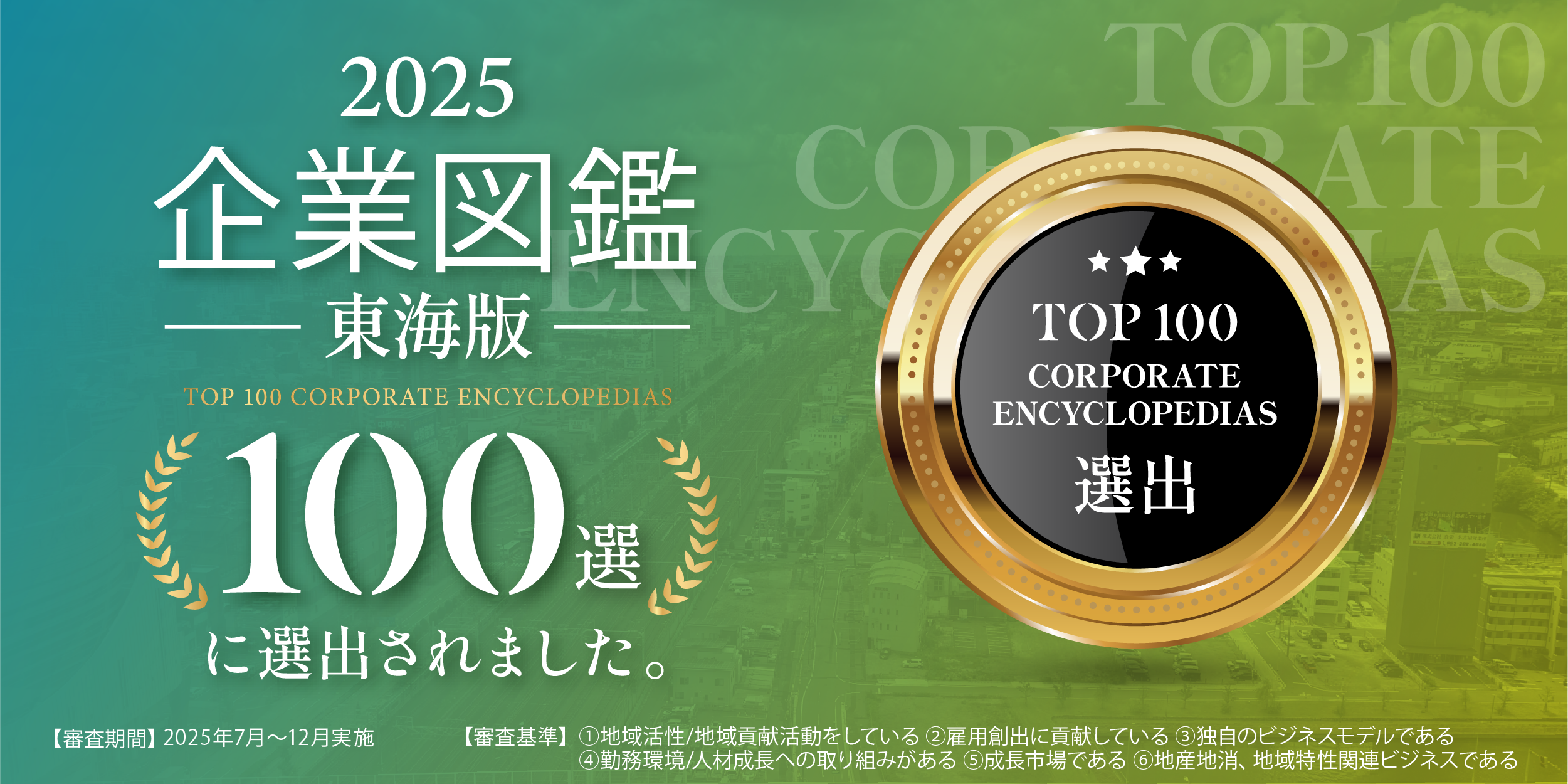 このたび、弊社は、「2025 企業図鑑 ―東海版―」(TOP 100 CORPORATE ENCYCLOPEDIAS)に、東海地方の優良企業100選として選出されましたことをご報告いたします。
